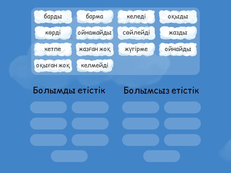 Болымды етістік: оқыды, жазды, барды, келеді, ойнайды, сөйлейді, көрді, Болымсыз етістік: оқыған жоқ, жазған жоқ, барма, келмейді, ойнамайды, кетпе, жүгірме,