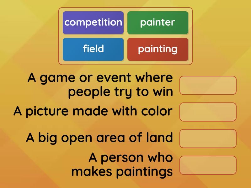 painting - A picture made with color , competition - A game or event where people try to win, painter - A person who makes paintings, field - A big open area of land ,