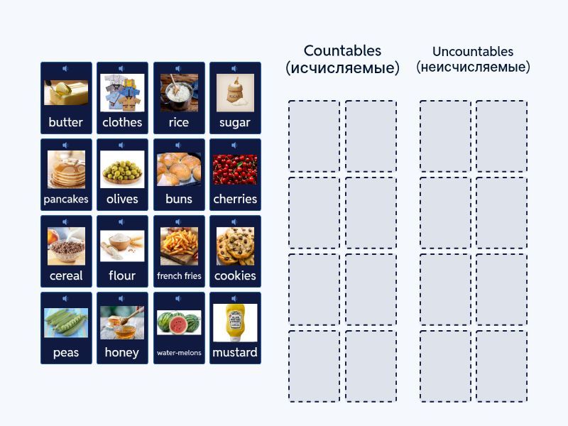 Countables (исчисляемые): buns, cherries, olives, water-melons, peas, pancakes, french fries, cookies, Uncountables (неисчисляемые): butter, cereal, mustard, honey, flour, rice, sugar, clothes,