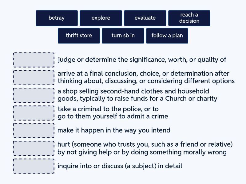 turn sb in - take a criminal to the police, or to go to them yourself to admit a crime, explore - inquire into or discuss (a subject) in detail, evaluate - judge or determine the significance, worth, or quality of, reach a decision - arrive at a final conclusion, choice, or determination after thinking about, discussing, or considering different options, betray - hurt (someone who trusts you, such as a friend or relative) by not giving help or by doing something morally wrong, follow a plan - make it happen in the way you intend, thrift store - a shop selling second-hand clothes and household goods, typically to raise funds for a Church or charity,