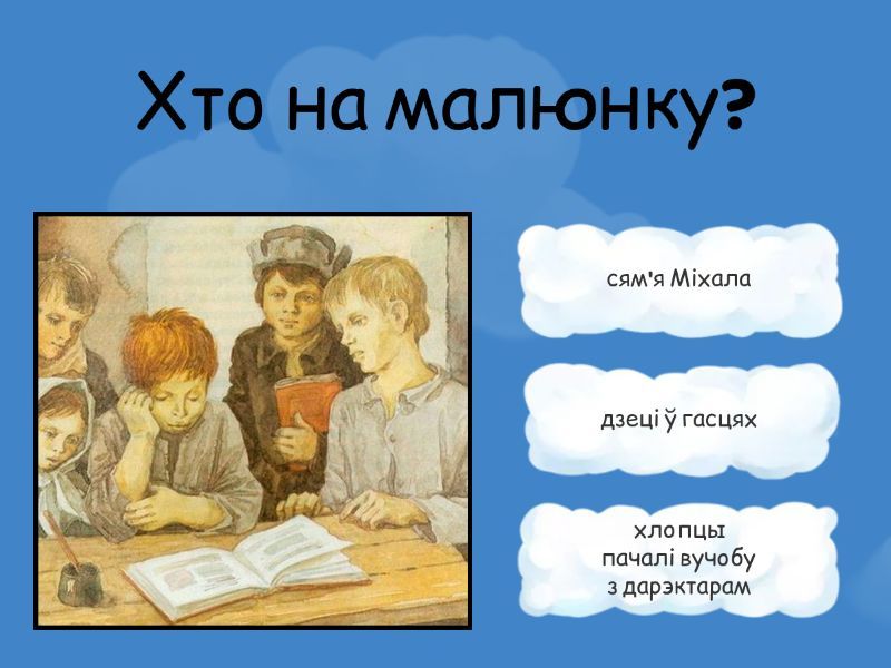 1) Хто на малюнку? a) сям'я Міхала b) дзеці ў гасцях c) хлопцы пачалі вучобу з дарэктарам 2) Як звалі дарэктара? a) Яська b) Костусь 3) Калі пачыналася вучоба ў дзяцей? a) верасень b) кастрычнік 4) на ніцях белай павуцінкі ( працягніце далей тэкст) a) прывозяць восень павучкі b) глядзіць твар восені-свякроўкі c) з жыццем і сонцам развітанне 5) Як звалі бацьку ў гэтым ўрыўку? a) Міхал b) Антось c) Костусь 6) Як звалі хлопцаў сям'і Міхала? a) Костусь b) Уладзік c) Алесь d) Яська 7) Костусь ужо чытаць умее? a) Люблю, але яшчэ не ўмею b) Не любіць c) Любіць 8) Дзе спаў дарэктар? a) З дзецьмі за печкай b) У асобным пакойчыку c) На печы d) Хадзіў дадому 9) Аўтар гэтага ўрыўка? a) М. Багдановіч b) Я. Колас c) Я. Купала d) М. Танк 10) "На ніцях белай павуціны..." - гэта ўрывак з паэмы .... a) "Сымон-музыка" b) "Безназоўнае" c) "Новая зямля" d) "Ля вогнішч начлежных"