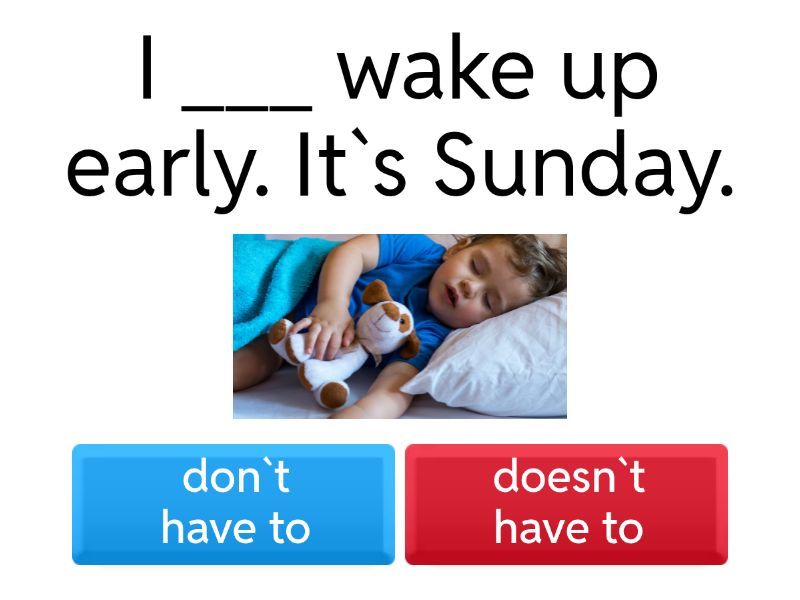 1) I ___ wake up early. It`s Sunday. a) don`t have to b) doesn`t have to 2) My parents ___ wear uniform at work. a) don`t have to b) doesn`t have to 3) He ___ do homework. Today is Sunday. a) don`t have to b) doesn`t have to 4) Tom ___ go shopping today. a) don`t have to b) doesn`t have to 5) They ___ work at night. a) don`t have to b) doesn`t have to 6) My dad ___ go to work on Saturdays. a) don`t have to b) doesn`t have to 7) My friends and I ___ go to school on Saturdays. a) don`t have to b) doesn`t have to 8) My mum ___ wash the dishes after lunch. a) don`t have to b) doesn`t have to 9) We ___ stay in Moscow in summer. We have a country house. a) don`t have to b) doesn`t have to 10) He ___ wear a coat. It`s warm today. a) don`t have to b) doesn`t have to 11) She ___ walk her dog at night. a) don`t have to b) doesn`t have to 12) My dad ___ wash his car today. It`s clean. a) don`t have to b) doesn`t have to 13) I ___ clean my room. It`s clean. a) don`t have to b) doesn`t have to 14) They ___ cook dinner today. They`re going to the cafe. a) don`t have to b) doesn`t have to 15) He ___ ride a bike today. It`s raining. a) don`t have to b) doesn`t have to