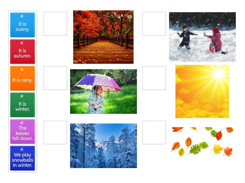 It is winter., It is sunny., It is rainy., It is autumn., The leaves fall down., We play snowballs in winter.,