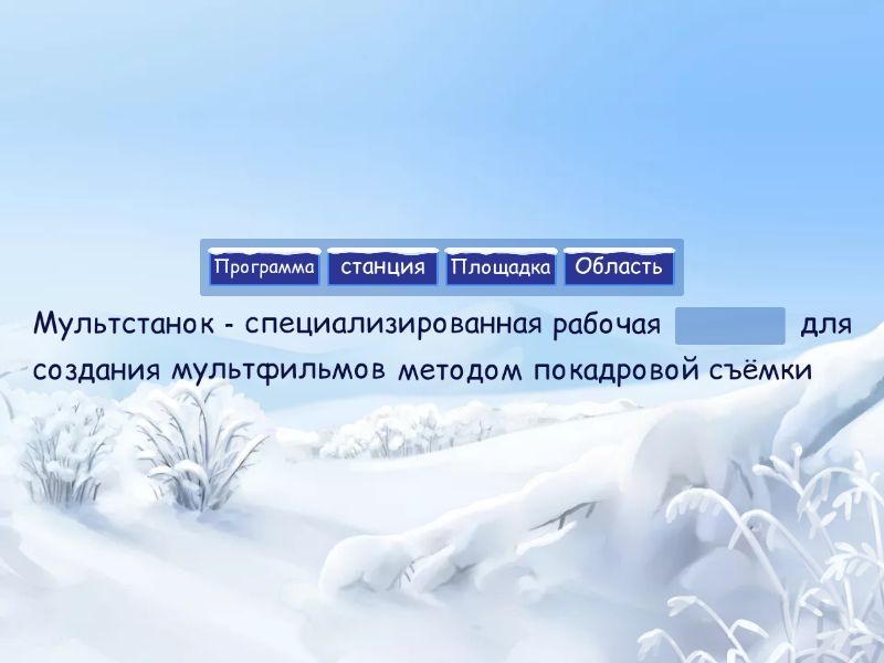 Мультстанок - специализированная рабочая ____ для создания мультфильмов методом покадровой съёмки Для съёмки мультфильмов используют: ____ светодиодные лампы; световые ____ с стёклами Для съёмки мультфильмов используют: ____ ____
