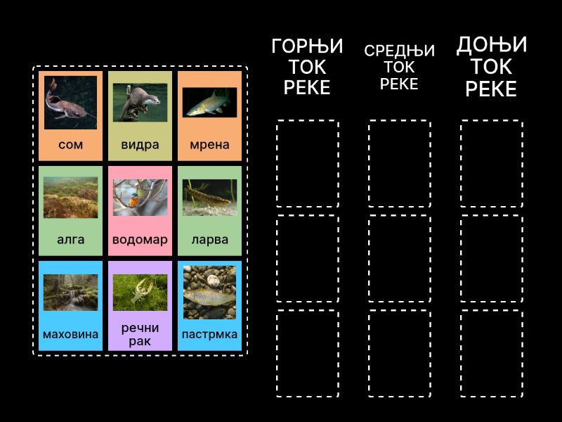ГОРЊИ ТОК РЕКЕ: пастрмка, маховина, водомар, СРЕДЊИ ТОК РЕКЕ: ларва, мрена, видра, ДОЊИ ТОК РЕКЕ: алга, речни рак, сом,