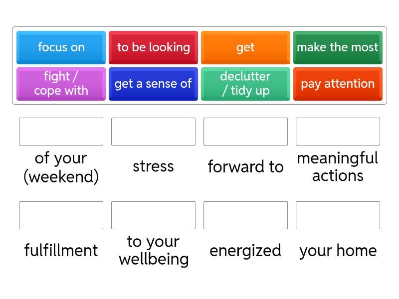to be looking - forward to, make the most - of your (weekend), get - energized, declutter / tidy up - your home, pay attention - to your wellbeing , fight / cope with - stress, get a sense of - fulfillment, focus on - meaningful actions,