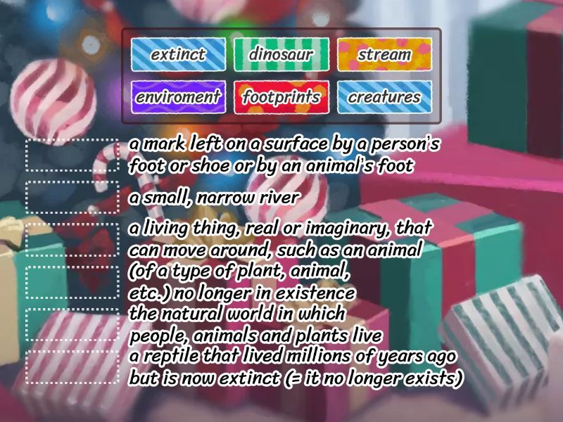 dinosaur - a reptile that lived millions of years ago but is now extinct (= it no longer exists), extinct - (of a type of plant, animal, etc.) no longer in existence, footprints - a mark left on a surface by a person’s foot or shoe or by an animal’s foot, creatures - a living thing, real or imaginary, that can move around, such as an animal, stream - a small, narrow river, enviroment - the natural world in which people, animals and plants live,