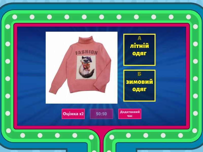 1) Який одяг носять взимку? a) Купальник b) Шуба c) Шорти d) Сандалі e) Шапка f) Рукавички 2) Який одяг носять влітку? a) Купальник b) Шуба c) Шорти d) Сандалі e) Шапка f) Рукавички 3) Що вдягнути восени? a) Рукавички b) Купальник c) Шорти d) Чоботи e) Шапка f) Плащ 4) Що вдягнути навесні? a) Купальник b) Плащ c) Шорти d) Чоботи e) Шапка f) Рукавички 5) Який одяг теплий? a) Шорти b) Купальник c) Шуба d) Сандалі e) Шапка f) Рукавички 6) Який одяг легкий? a) Купальник b) Шуба c) Рукавички d) Сандалі e) Шапка f) Шорти 7) Що вдягнути в дощ? a) Плащ b) Купальник c) Шорти d) Чоботи e) Шапка f) Рукавички