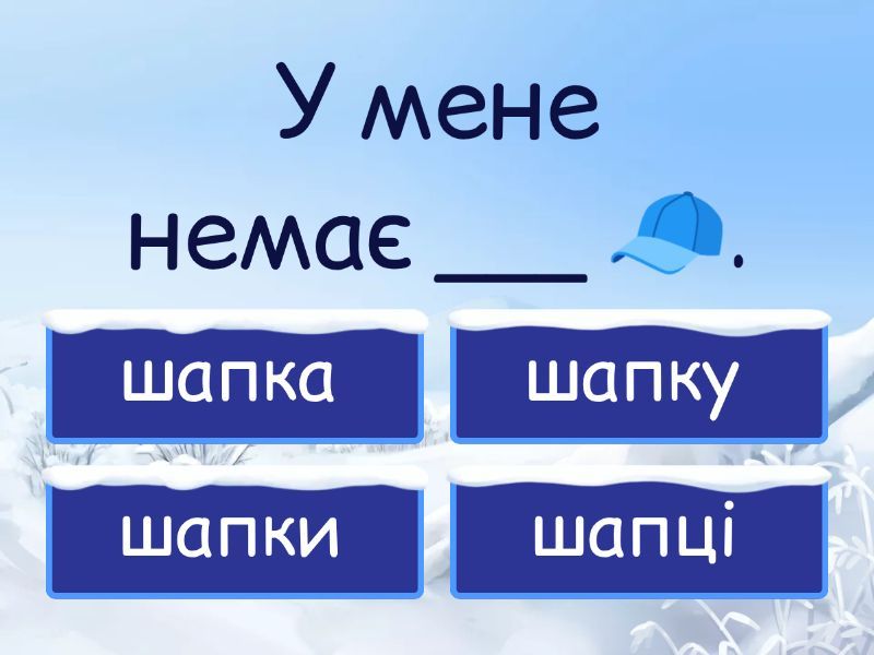 1) У мене немає ___ 🧢. a) шапка b) шапку c) шапки d) шапці 2) У мене немає ___ 👢. a) чоботи b) чоботам c) чоботами d) чобіт 3) У мене немає ___ 🎧. a) навушники b) навушнику c) навушників d) навушниками 4) У мене немає ___ 🧶. a) светр b) светрі c) светром d) светра 5) У мене немає ___ 🧥. a) пальто b) пальтом c) пальті d) пальта 6) У мене немає ___ 🧣. a) шарф b) шарфом c) шарфа d) шарфі 7) У мене немає ___ 🧤. a) рукавички b) рукавицями c) рукавичці d) рукавичок 8) У мене немає ___ 🧦. a) шкарпетки b) шкарпетками c) шкарпетці d) шкарпеток 9) У мене немає ___ 👖. a) штани b) штанами c) штанах d) штанів 10) У мене немає ___ . a) колготки b) колготках c) колготками d) колготок