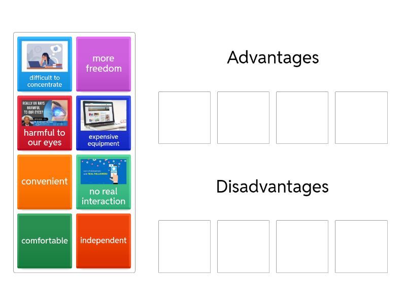Advantages: convenient , comfortable, more freedom, independent, Disadvantages: difficult to concentrate, no real interaction, harmful to our eyes, expensive equipment,