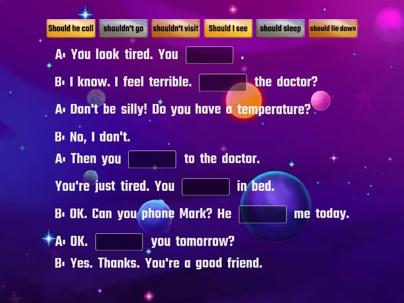 A: You look tired. You ____ . B: I know. I feel terrible. ____ the doctor? A: Don't be silly! Do you have a temperature? B: No, I don't. A: Then you ____ to the doctor. You're just tired. You ____ in bed. B: OK. Can you phone Mark? He ____ me today. A: OK. ____ you tomorrow? B: Yes. Thanks. You're a good friend.