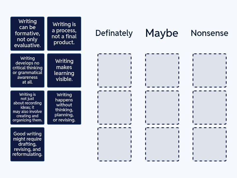 Definately: Writing makes learning visible., Writing is a process, not a final product., Writing can be formative, not only evaluative., Maybe: Writing is not just about recording ideas; it may also involve creating and organizing them., Good writing might require drafting, revising, and reformulating., Nonsense: Writing happens without thinking, planning, or revising., Writing develops no critical thinking or grammatical awareness at all.,
