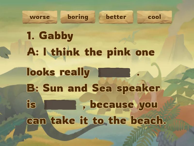 1. Gabby A: I think the pink one looks really ____ . B: Sun and Sea speaker is ____ , because you can take it to the beach. 2. Mark A: I ____ the On-the-Glo’ speaker has a good design. B: In my opinion, the Mini speaker is better. You can carry it in your ____. 3. Tim A: I like the Mini speaker, but it ____ . B: I think the Sun and Sea speaker is ____ to carry around. C: The On-the-Glo’ speaker ____ as small as the Mini, but I don’t mind.