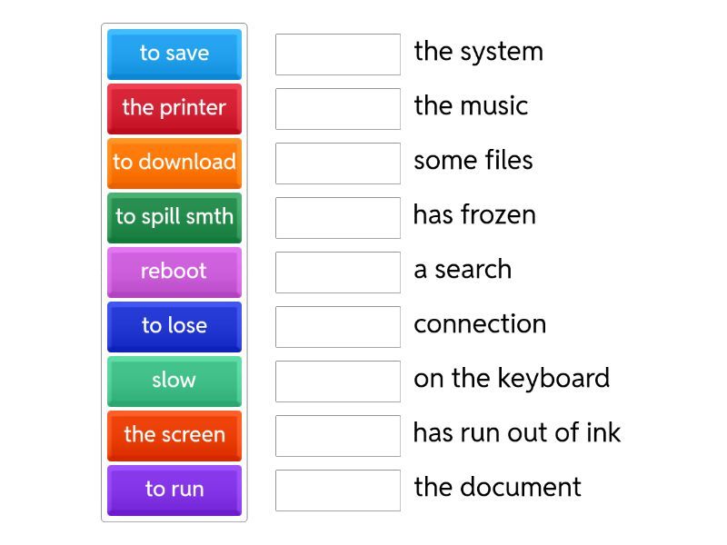 the screen - has frozen, to save - the document, slow - connection, to lose - some files, the printer - has run out of ink, to spill smth - on the keyboard, to download - the music, reboot - the system, to run - a search,