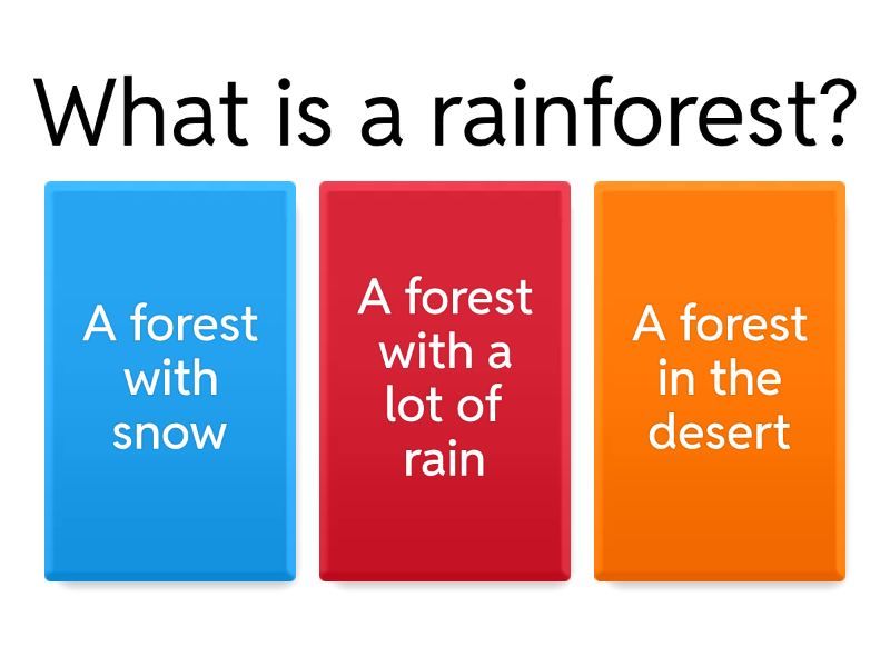 1) What is a rainforest? a) A forest with snow b) A forest with a lot of rain c) A forest in the desert 2) How much rain do rainforests get every year? a) 0.5 m b) 1 m c) 1.8–3 m 3) What is the name of the largest rainforest in the world? a) Sahara b) Amazon rainforest c) Arctic forest 4) In which country is most of the Amazon rainforest? a) Peru b) Colombia c) Brazil 5) Why is the Amazon rainforest important? a) It has many cities b) It has many animals and plants c) It has roads 6) What do trees give out? a) Carbon dioxide b) Oxygen c) Smoke 7) What gas do we need to breathe? a) Oxygen b) Carbon dioxide c) Nitrogen