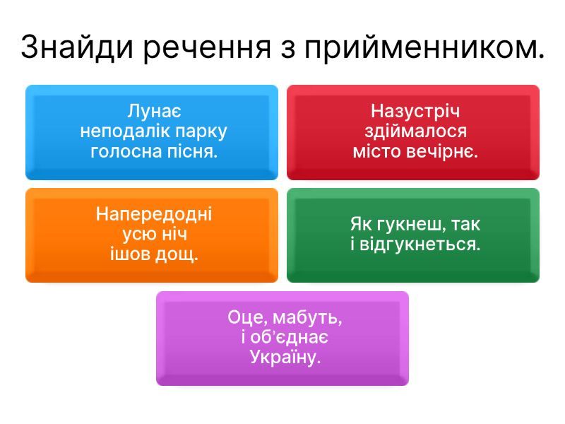 1) Знайди речення з прийменником. a) Лунає неподалік парку голосна пісня. b) Назустріч здіймалося місто вечірнє. c) Напередодні усю ніч ішов дощ. d) Як гукнеш, так і відгукнеться. e) Оце, мабуть, і об’єднає Україну. 2) Знайди речення зі сполучником. a) Дбай ,сину, про своїх друзів: вони повинні бути добрі. b) А добрі друзі -запорука успіху. c) Не гріє сонце на чужині. d) Час за гроші не зможеш купити. e) Батьківщина починається для людини зі шматка неба. 3) Вибери речення із часткою. a) В долині – луки, трава по пояс. b) Було у нього щось тривожне. c) Час – не наша власність. d) Дівчина немов квітка. e) Зроблю все, аби помагали. 4) Вибери речення, у якому ЩОБ є сполучником. a) Що/б там не казав. а кожне слово наперед обміркуй. b) Що/б не трапилось, усе обміркуй. c) Що/б вода не принесла, вона ж і забере. d) Що/б то був за швець, коли б усім на один копит чоботи шив. e) Для того коваль обценьки бере, що/б рук не пекло. 5) У якому варіанті прийменник вжито правильно? a) Виконувати по зразку b) вишивати по шовку c) лекція по історії d) проживати по адресі e) їхати по виклику 6) Знайди словосполучення, у якому поєднання «прийменник + іменник» виражає часові відношення. a) Витягти з кишені b) Зайти під вечір c) Не виконати через хворобу d) Тремтіти від холоду e) Жити заради добра 7) Знайди речення з модальною часткою. a) Нехай здійсняться ваші мрії. b) Хотіла б я піснею стати. c) То був дужий гірський орел. d) Ні дід, ні ми не розуміли прочитаного, і це завжди хвилювало нас. e) Якби широколисті дерева не скидали листя, вони просто всохли б. 8) Обери речення, яке не потребує редагування. a) Він приїхав в шість годин. b) В сім годин ми зустрінемося. c) Пробило шість годин. d) Обідня перерва з другої до третьої. e) Котра година? — Сім. 9) В усіх реченнях вжито вигук, ОКРІМ a) Цитьте, діти, контрольна ще триває. b) Досить говорити про те, що ніколи не справдиться. c) А солов’ї за вікном тьох-тьох. d) Ой, я не знала, що ти тут чекаєш. e) Агов, люди, відгукніться! 10) Знайди речення, у якому вигук виконує роль присудка. a) Протягли своє "ку-ку-рі-ку" горлаті півні. b) Тисячне "ура!" грозою сколихнуло податливі набряклі луги. c) А качка ках-ках. 11) Обери речення з вигуками мовного етикету. a) Ой, заграй, заграй, синеньке море. b) Добрий вечір, люди добрі. c) Цить! Хай говорить серце. d) Пливе човен, води повен. Та все хлюп-хлюп-хлюп-хлюп!.. e) - Марш мені зараз малину рвати!
