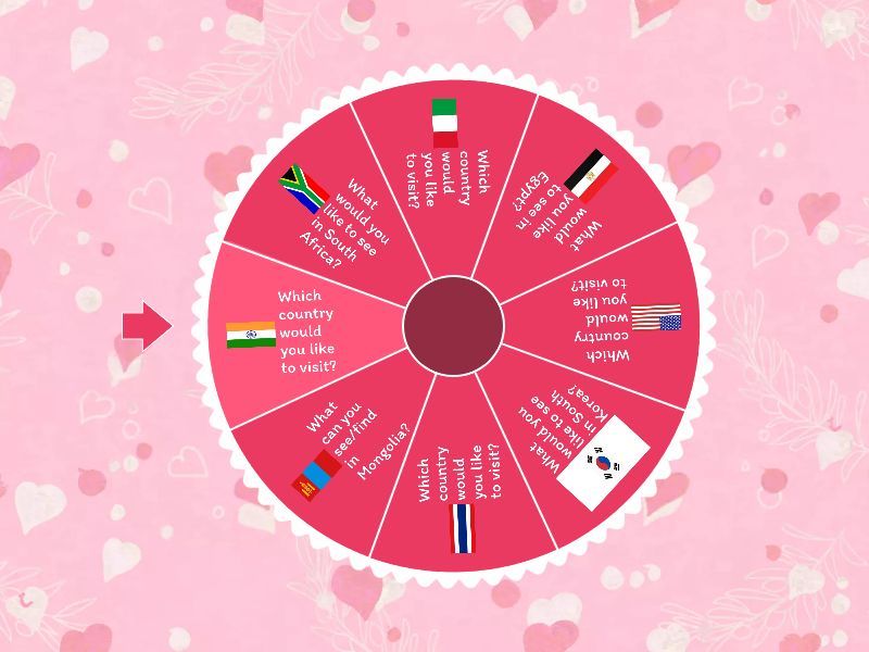 1) What would you like to see in South Africa? 2) Which country would you like to visit? 3) What would you like to see in Egypt? 4) Which country would you like to visit? 5) What would you like to see in South Korea? 6) Which country would you like to visit? 7) What can you see/find in Mongolia? 8) Which country would you like to visit?