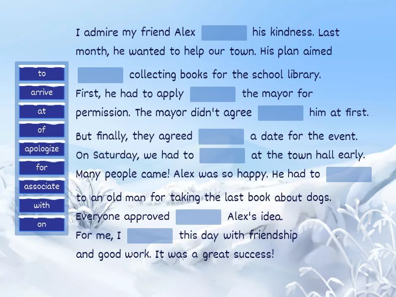 I admire my friend Alex ____ his kindness. Last month, he wanted to help our town. His plan aimed ____ collecting books for the school library. First, he had to apply ____ the mayor for permission. The mayor didn't agree ____ him at first. But finally, they agreed ____ a date for the event. On Saturday, we had to ____ at the town hall early. Many people came! Alex was so happy. He had to ____ to an old man for taking the last book about dogs. Everyone approved ____ Alex's idea. For me, I ____ this day with friendship and good work. It was a great success! My friend Nina decided to enter a school cooking competition. She wanted her dish to appeal ____ the judges. She planned to ____ fresh herbs to her soup. The day before, Nina couldn't access the school kitchen. She had to ask the janitor ____ the key. But her brother started to argue ____ her about using the kitchen at home. Later, Nina's brother made a mistake. He accused her ____ using all the salt! This argument began to ____ Nina's mood. The next morning, she asked the teacher ____ the rules. Finally, it was time for the competition. I went to ____ the event. Nina's soup was delicious and she won a prize! There is not much to do today. There ____ dark clouds in the sky. I look out of my window. There ____ very little sunshine. I don’t have ____ plans. I decide to read a book. I have a large ____ of books on my shelf. There is a wide ____ of stories: adventure, mystery, and fantasy. I don’t have ____ time for reading usually, but today I have plenty ____ time. Later, I feel hungry. I look in the kitchen. ____ are several apples on the table. I also have a great ____ of bread. I make a snack. It is a quiet day, but a good one. I am not sad. I have ____ problems today. I felt nervous ahead ____ my birthday party. ____ addition to my family, my whole class was coming. According ____ my sister, everyone would love the games. ____ average, I help with dinner, but today I prepared in ____. Apart ____ the cake, all the food was ready. Then, my friends arrived! We played, ate, and laughed. All in ____, it was the best party ever. My new tablet gives me access ____ many games. The main advantage ____ it is learning. But a ____ of screens is they can hurt your eyes. I saw an advertisement ____ an art class. I needed advice ____ how to join. ____ answer to my question, Mum said I should make an appointment with the teacher. At the class, the teacher told me to ____ attention to my drawing. My ____ to learning is very positive. I was happy to discover my ____ in painting! Our school got access ____ a new gym. The main advantage ____ it is modern equipment. A disadvantage of the old gym was its size. We saw an advertisement ____ a basketball coach. I ____ my friend Tom for his skill, so I ____ for advice ____ joining. Our aim was to win the first match. When the coach arrived ____ our city, we met him at the station. We arrived ____ the gym early for practice. During the game, I made a mistake. I had to ____ to the team for my error. But the coach said he ____ of our effort. We learned a lot that day! According ____ my music teacher, I had real talent. In ____ to my weekly lesson, she advised me to practise for one hour each day. ____ average, I did forty-five minutes, but I knew I needed to do more ahead ____ the big concert. I asked my teacher ____ advice on which piece to play. ____ answer to my question, she suggested a beautiful, but difficult, sonata. To work on it, I decided to ____ an appointment with her for extra help. She told me I must ____ attention to the slow, quiet parts. Her positive ____ to hard work inspired me. With focus, I knew I could improve my ____ in playing with feeling. My friend Lena and I did a project for school. We needed to agree ____ a topic. I wanted a project about space, and she had to agree ____ me because the idea really appealed ____ her. To get books, we had to apply to the librarian ____ special access to the old library. Ahead ____ our meeting, we prepared our questions ____ advance. Apart ____ some dusty shelves, the library was great. The librarian, however, did not ____ of our messy notes! She even ____ us of being disorganized. We promised to be neater. All in ____, it was a success. For me, libraries will always ____ with the fun of discovering something new with a good friend. My brother Mark saw an advertisement ____ a free coding workshop. He wanted to attend it, but needed access ____ a laptop. He decided to ask our parents for one. He asked me for advice ____ how to convince them. I told him to add his good grades to his request. He then made an appointment ____ Dad to talk. At first, they argued with him ____ the cost. Mark explained that bad computer skills can affect future job chances. A main disadvantage ____ not learning now is falling behind. ____ answer to their questions, he showed them the workshop details. Dad told him to pay ____ to the teacher and not just games. They liked his serious attitude to learning and finally agreed! Mark was excited to discover his ____ in something new. 1.The rainy weather ____ my mood. 2.I ____ English classes every Tuesday. 3.____ average, I drink six glasses of water a day. 4.Why do you accuse me ____ being late? I am on time! 5.I need to ask ____ help with my homework. 6.She makes an appointment ____ the dentist every six months. 7.Please pay attention ____ the teacher. 8.Apart ____ Maria, everyone is here today. 9.____ to the weather app, it is sunny today. 10.My bus arrives ____ 8 o'clock every morning.