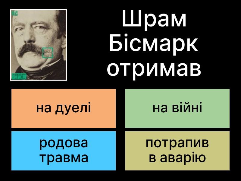 1) Шрам Бісмарк отримав a) на дуелі b) на війні c) родова травма d) потрапив в аварію 2) Яку мову не знав Бісмарк a) російську b) італійську c) англійську d) іспанську 3) За що Фердинанд Коен-Блінд намагався вбити Бісмарка? a) за любовну образу b) помста за смерть батька c) через політику Бісмарка d) хотів прославитись 4) Бісмарк був відомий a) кошатник b) собачатник c) не любив тварин d) розводив ведмедів 5) Бісмарк народився у a) Австрії b) Баварії c) Пруссії d) Мекленбург-Шверін 6) Чи мав Бісмарк сім'ю? a) так b) ні 7) Скільки дітей було у Бісмарка? a) 3 b) 5 c) 7 d) 8 8) Що таке Культуркампф? a) Поширення початкової освіти b) Поширення вищої освіти c) Закриття релігійних шкіл d) Друк книжок 9) Realpolitik - це a) діяти заради вигоди b) діяти залізом та кров'ю c) діяти дипломатією d) популізм та демагогія 10) Для якої з перелічених країнах Бісмарк є ворогом та гнобителем a) Німеччина b) росія c) Британія d) Польща 11) Бісмарк був канцлером a) майже 20 років b) майже 30 років c) майже 35 років d) майже 40 років 12) До якої конфесії належав Бісмарк? a) католик b) православний c) лютеранін d) кальвініст