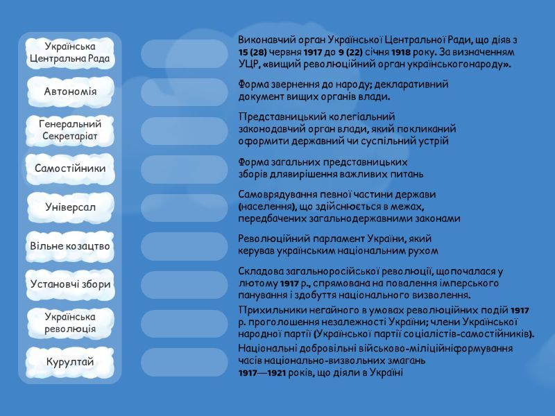 Українська Центральна Рада - Революційний парламент України, який керував українським національним рухом, Автономія - Самоврядування певної частини держави (населення), що здійснюється в межах, передбачених загальнодержавними законами, Самостійники - Прихильники негайного в умовах революційних подій 1917 р. проголошення незалежності України; члени Української народної партії (Української партії соціалістів-самостійників)., Універсал - Форма звернення до народу; декларативний документ вищих органів влади., Генеральний Секретаріат - Виконавчий орган Української Центральної Ради, що діяв з 15 (28) червня 1917 до 9 (22) січня 1918 року. За визначенням УЦР, «вищий революційний орган українськогонароду»., Установчі збори - Представницький колегіальний законодавчий орган влади, який покликаний оформити державний чи суспільний устрій, Вільне козацтво - Національні добровільні військово-міліційніформування часів національно-визвольних змагань 1917—1921 років, що діяли в Україні, Курултай - Форма загальних представницьких зборів длявирішення важливих питань, Українська революція - Складова загальноросійської революції, щопочалася у лютому 1917 р., спрямована на повалення імперського панування і здобуття національного визволення.,