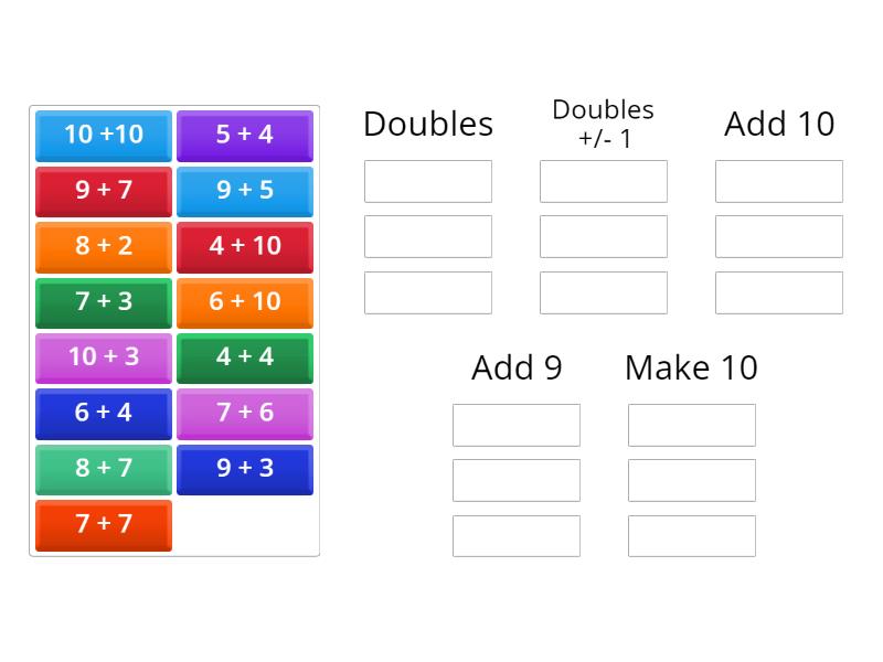 Doubles: 4 + 4, 10 +10, 7 + 7, Doubles +/- 1: 8 + 7, 7 + 6, 5 + 4, Add 10: 4 + 10, 6 + 10, 10 + 3, Add 9: 9 + 3, 9 + 5, 9 + 7, Make 10: 6 + 4, 7 + 3, 8 + 2,