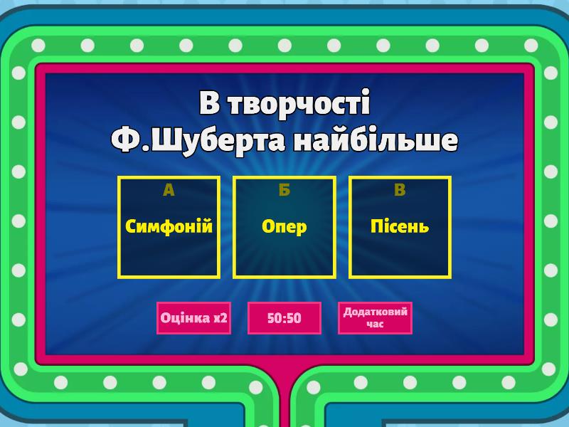 1) Й.С.Бах - це композитор епохи a) Класицизму b) Барокко c) Романтизму 2) Ф.Шопен це композитор a) Романтик b) Класик c) Імпресіоніст 3) А.Вівальді писав a) Концерти b) Ноктюрни c) Симфонії 4) В творчості Ф.Шуберта найбільше a) Симфоній b) Опер c) Пісень 5) Н.Паганіні був віртуозом a) Скрипалем b) Органістом c) Піаністом 6) Л.ван Бетховен дружив з a) Нікколо Паганіні b) Андрієм Розумовським c) Робертом Шуманом 7) Й.Гайдн мав поїздки в a) Америку b) Італію c) Англію 8) Р.Шуман автор a) "Альбому для юнацтва" b) концерту "Пори року" c) Угорської рапсодії 9) В-А Моцарт автор a) увертюри "Егмонт" b) опери "Чарівна флейта" c) вокального циклу "Прекрасна мельничка" 10) Ф.Ліст навчався в a) В-А. Моцарта b) Й. Гайдна c) К. Черні 11) Опера "Кармен" - це твір a) Ф.Ліста b) Ф.Шопена c) Ж.Бізе 12) Клод Дебюссі - композитор a) романтик b) імпресіоніст c) класик