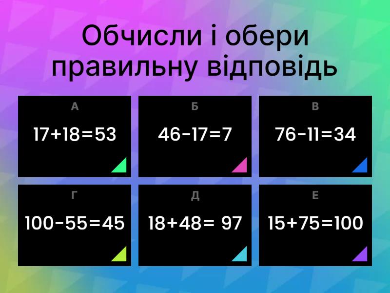 1) Обчисли і обери правильну відповідь a) 17+18=53 b) 46-17=7 c) 76-11=34 d) 100-55=45 e) 18+48= 97 f) 15+75=100