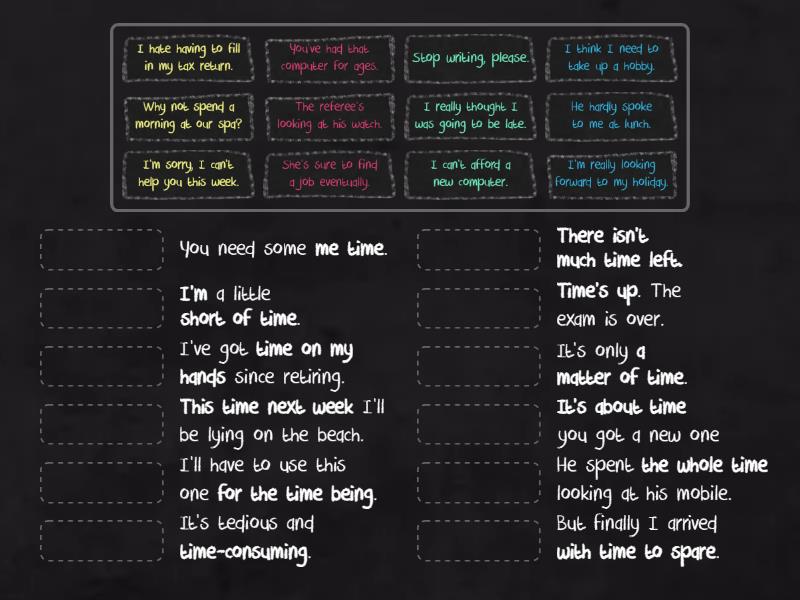 He hardly spoke to me at lunch. - He spent the whole time looking at his mobile., I'm really looking forward to my holiday. - This time next week I'll be lying on the beach., I'm sorry, I can't help you this week. - I'm a little short of time., I can't afford a new computer. - I'll have to use this one for the time being., She's sure to find a job eventually. - It's only a matter of time., I think I need to take up a hobby. - I've got time on my hands since retiring., Stop writing, please. - Time's up. The exam is over., I really thought I was going to be late. - But finally I arrived with time to spare., Why not spend a morning at our spa? - You need some me time., I hate having to fill in my tax return. - It's tedious and time-consuming., You've had that computer for ages. - It's about time you got a new one, The referee's looking at his watch. - There isn't much time left.,