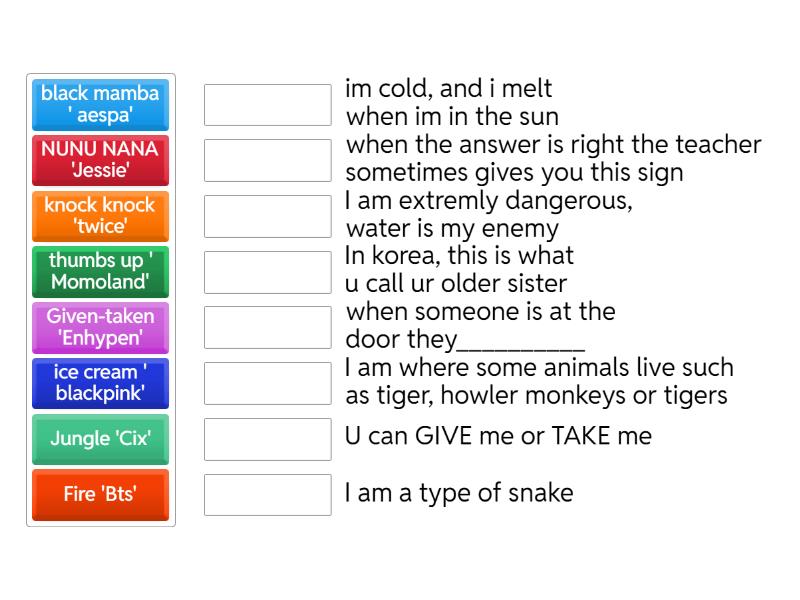 Fire 'Bts' - I am extremly dangerous, water is my enemy , NUNU NANA 'Jessie' - In korea, this is what u call ur older sister , Jungle 'Cix' - I am where some animals live such as tiger, howler monkeys or tigers, black mamba ' aespa' - I am a type of snake, Given-taken 'Enhypen' - U can GIVE me or TAKE me , ice cream ' blackpink' - im cold, and i melt when im in the sun, knock knock 'twice' - when someone is at the door they__________, thumbs up ' Momoland' - when the answer is right the teacher sometimes gives you this sign ,