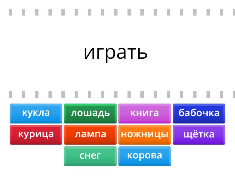 кукла - играть, курица - яйцо, ножницы - резать, лошадь - сани, книга - учитель, бабочка - муха, снег - зима, лампа - вечер, щётка - зубы, корова - молоко,
