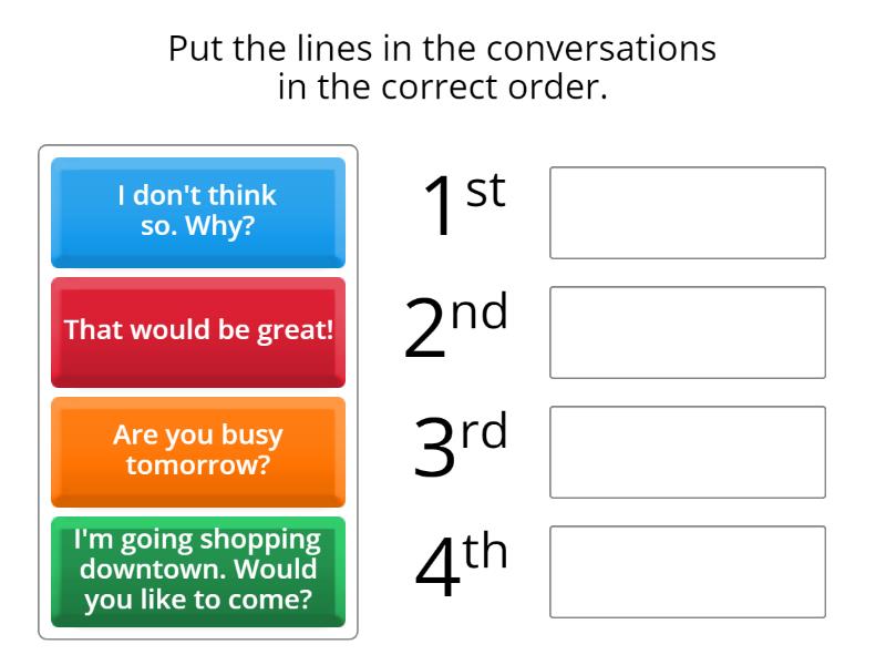 Are you busy tomorrow?, I don't think so. Why?, I'm going shopping downtown. Would you like to come?, That would be great!.