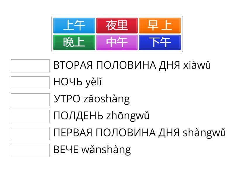 早 上 - УТРО zǎoshàng, 上午 - ПЕРВАЯ ПОЛОВИНА ДНЯ shàngwǔ, 中午 - ПОЛДЕНЬ zhōngwǔ, 下午 - ВТОРАЯ ПОЛОВИНА ДНЯ xiàwǔ, 晚上 - ВЕЧЕ wǎnshàng, 夜里 - НОЧЬ yèlǐ,