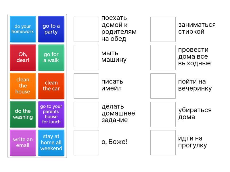 go for a walk - идти на прогулку, go for a run - пойти на пробежку, clean the car - мыть машину, clean the house - убираться дома, do the washing - заниматься стиркой, do your homework - делать домашнее задание, write an email - писать имейл, write a report - писать доклад/отчет, go away for the weekend - уехать на выходные, go away for a couple of days - уехать на пару дней, have a great time - отлично провести время, have a bad cold - сильно простудиться, go to a party - пойти на вечеринку, go to your parents' house for lunch - поехать домой к родителям на обед, stay with friends - остановиться у друзей, stay at home all weekend - провести дома все выходные, Oh, dear! - о, Боже!, You're joking! - Ты шутишь!, What a shame - Какая жалость,