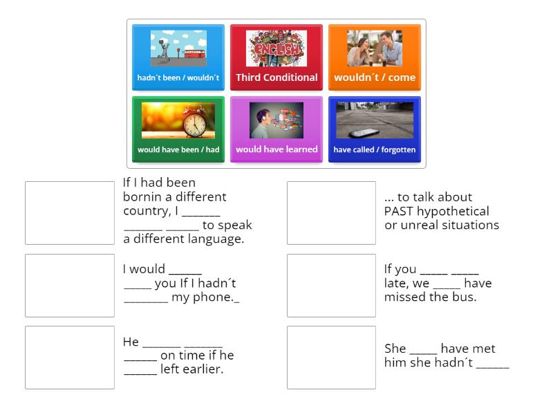 wouldn´t / come - She _____ have met him she hadn´t ______, Third Conditional - ... to talk about PAST hypothetical or unreal situations, have called / forgotten - I would ______ _____ you If I hadn´t ________ my phone._, would have learned - If I had been bornin a different country, I _______ _______ ______ to speak a different language., would have been / had - He _______ _______ ______ on time if he ______ left earlier., hadn´t been / wouldn´t - If you _____ _____ late, we _____ have missed the bus. ,