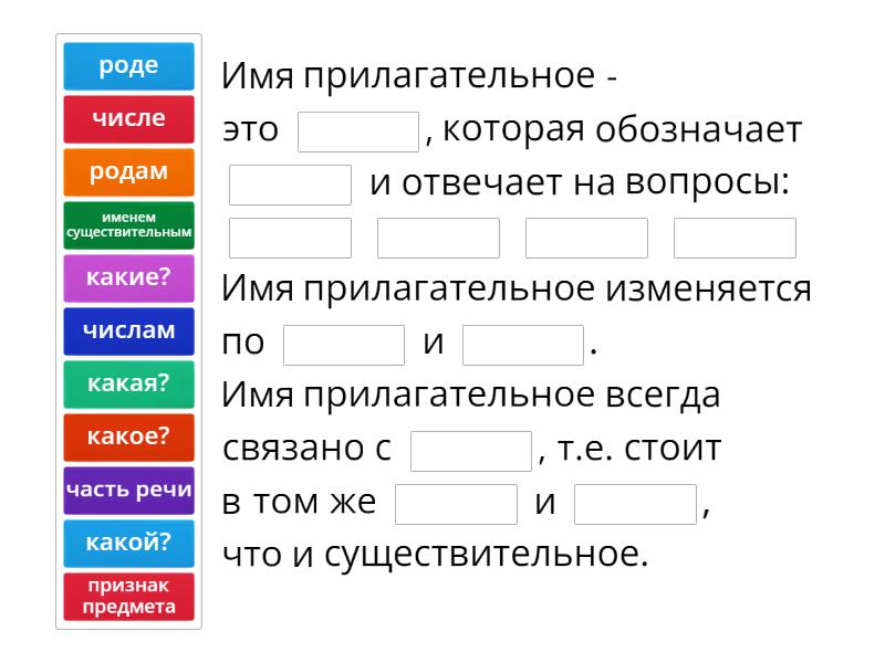 Имя прилагательное - это ____, которая обозначает ____ и отвечает на вопросы: ____ ____ ____ ____ Имя прилагательное изменяется по ____ и ____. Имя прилагательное всегда связано с ____, т.е. стоит в том же ____ и ____, что и существительное.