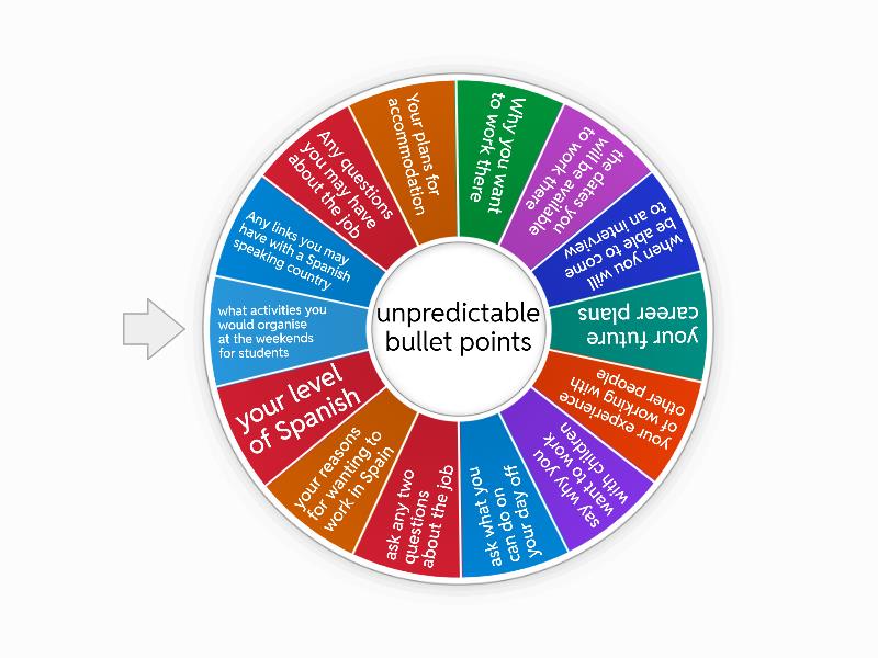 1) Any links you may have with a Spanish speaking country 2) Any questions you may have about the job 3) Your plans for accommodation 4) Why you want to work there 5) the dates you will be available to work there 6) when you will be able to come to an interview 7) your future career plans 8) your experience of working with other people 9) say why you want to work with children 10) ask what you can do on your day off 11) ask any two questions about the job 12) your reasons for wanting to work in Spain 13) your level of Spanish 14) what activities you would organise at the weekends for students