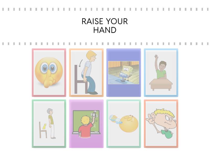 RAISE YOUR HAND, SILENCE, PLEASE, SIT DOWN, STAND UP, CAN I CLEAN THE BOARD, PLEASE?, MAY I SHARPEN MY PENCIL, PLEASE?, CAN I DRINK SOME WATER, PLEASE?, CAN YOU REPEAT, PLEASE?,