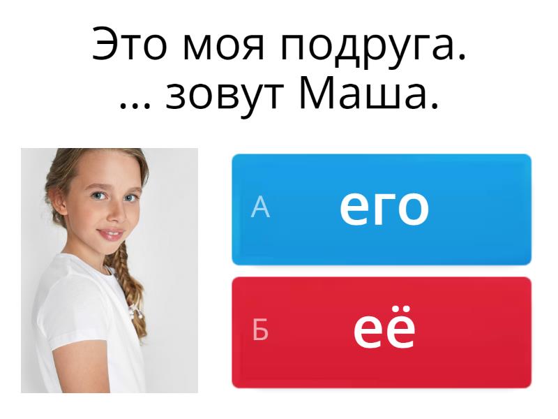 1) Это моя подруга. ... зовут Маша. a) его b) её 2) Это моя подруга. ... зовут Вика. a) его b) её 3) Это мой друг. ... зовут Миша. a) его b) её 4) Это мой друг. ... зовут Марк. a) его b) её 5) Это моя бабушка. ... зовут Валентина. a) его b) её 6) Это мой дедушка. ... зовут Николай. a) его b) её 7) Это мой папа. ... зовут Никита. a) его b) её 8) Это мой брат. ... зовут Лео. a) его b) её 9) Это моя сестра. ... зовут Алёна. a) его b) её 10) Это моя мама. ... зовут Влада. a) его b) её