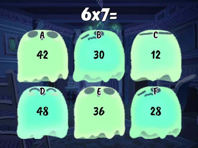 1) 6x7= a) 42 b) 30 c) 12 d) 48 e) 36 f) 28 2) 5x2= a) 20 b) 10 c) 13 d) 24 e) 14 f) 32 3) 4x5= a) 20 b) 24 c) 26 d) 35 e) 14 f) 54 4) 12x4= a) 48 b) 14 c) 59 d) 23 e) 36 f) 19 5) 7x6= a) 42 b) 16 c) 35 d) 21 e) 48 f) 23