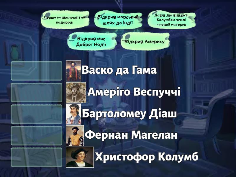 Відкрив Америку - Христофор Колумб, Відкрив мис Доброї Надії - Бартоломеу Діаш, Відкрив морський шлях до Індії - Васко да Гама, Довів ,що відкриті Колумбом землі - новий материк - Амеріго Веспуччі, Перша навколосвітня подорож - Фернан Магелан,