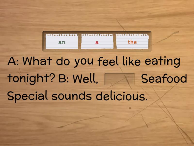 A: What do you feel like eating tonight? B: Well, ____ Seafood Special sounds delicious. A: I'm in the mood for ____ really spicy dish. B: Well, what about ____ Thai Chicken? Thai food is usually spicy. A: There are two kinds of soup: chicken noodle and mixed vegetable. B: I think I'd like ____ Chicken Noodle. I'm not ____ big vegetable fan. A: What would you like for your main course? We have ____ nice grilled chicken special on ____ menu tonight. B: That sounds good. I'll have ____ Chicken Special.