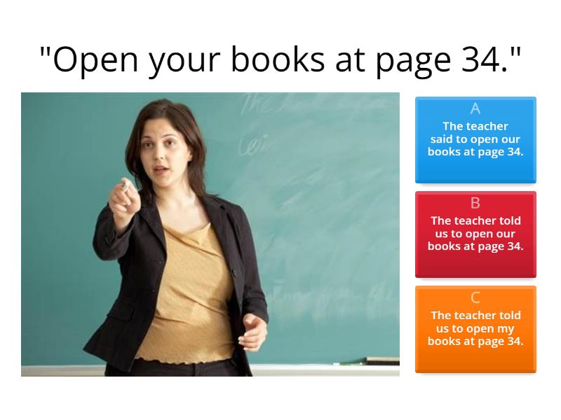 1) "Open your books at page 34." a) The teacher said to open our books at page 34. b) The teacher told us to open our books at page 34. c) The teacher told us to open my books at page 34. 2) "Don't eat in the library!" a) The teacher told us not to eat in the library. b) The teacher said us not to eat in the library. c) The teacher told us don't eat in the library. 3) "Take these pills twice a day." a) The doctor told me to took those pills twice a day. b) The doctor told me to take those pills twice a day. c) The doctor told me take these pills twice a day. 4) "Stay in bed for two days." a) The doctor told me to stay in bed for two days. b) The doctor told me stay in bed for two days. c) The doctor said stay in bed for two days. 5) "Don't cross the road." a) The police officer told us to cross the road. b) The police officer told us cross the road. c) The police officer told us not to cross the road. 6) "Don't park here." a) The police officer told my dad to park here. b) The police officer told my dad don't park here. c) The police officer told my dad not to park there. 7) "Eat your vegetables." a) My mum said eat your vegetables. b) My mum told me to eat my vegetables. c) My mum told me to eat your vegetables. 8) "Can you do the dishes, son?" a) My mum asked can you do the dishes. b) My mum told me can you do the dishes. c) My mum asked me to do the dishes.