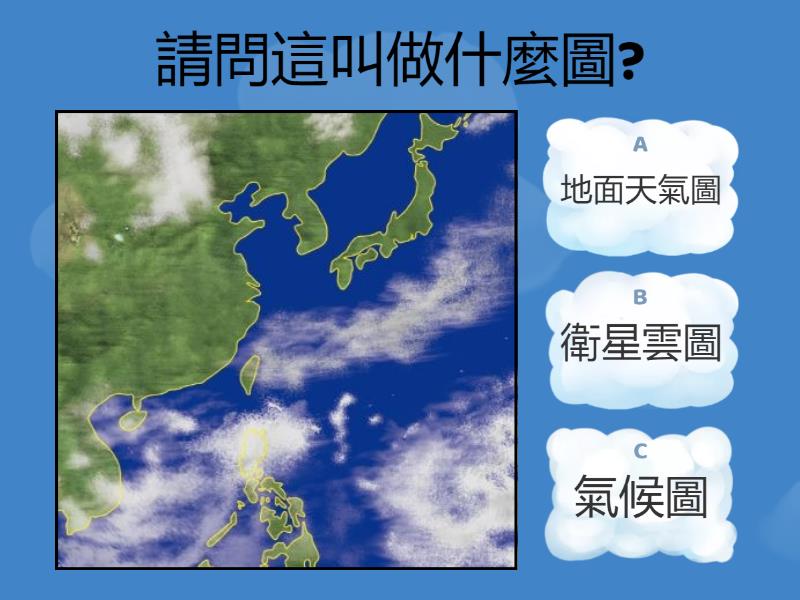 1) 請問這叫做什麼圖? a) 地面天氣圖 b) 衛星雲圖 c) 氣候圖 2) 請問這叫做什麼圖? a) 地面天氣圖 b) 衛星雲圖 c) 氣候圖 3) 請問這叫做什麼圖? a) 地面天氣圖 b) 衛星雲圖 c) 氣候圖 4) 圖中的曲線是? a) 等壓線 b) 等高線 c) 等雨量線 d) 等溫線 5) 此時最可能處於何種天氣現象? a) 颱風 b) 梅雨 c) 寒流 d) 乾旱 6) 請問圖中一月的氣溫? a) 10℃ b) 15℃ c) 21℃ 7) 請問圖中七月的雨量? a) 40mm b) 100mm c) 400mm d) 550mm 8) 請問此圖的年溫差為多少度? a) 4度 b) 8度 c) 20度 d) 28度 9) 請問下列哪句話較適合用來形容此氣候圖所在地區? a) 乾溼分明,冬雨集中 b) 乾溼分明,夏雨集中 c) 全年多雨,溫和濕潤 d) 乾燥少雨,年溫差小 10) 此時最適合用哪句話來形容? a) 寒流發威,冷氣團南下 b) 颱風過境,狂風暴雨 c) 梅雨季節來臨 d) 西北雨,直直落 11) 此時最適合用哪句話來形容? a) 颱風過境,狂風暴雨 b) 寒流發威,冷氣團南下 c) 西北雨,直直落 d) 梅雨季節來臨