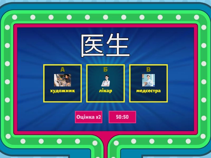 1) 医生 a) художник b) лікар c) медсестра 2) 画家 a) письменник b) художник c) інженер d) вчена 3) 工程师 a) актор b) співак c) інженер 4) 商人 a) письменник b) лікар c) бізнемен 5) 工人 a) робітник b) співачка c) вчений d) письменниця 6) 教师 a) робітники b) вчитель c) продавець d) актор 7) 护士 a) співак b) актор c) медсестра 8) 校长 a) школа b) актор c) продавець d) директор 9) 售货员 a) бізнесмен b) продавець c) водій 10) 司机 a) водій b) вчитель c) інженер 11) 演员 a) вчений b) робітник c) акторка d) школа 12) 作家 a) художник b) співак c) письменник 13) 科学家 a) вчений b) водій c) вчитель 14) 歌手 a) медсестра b) письменник c) співачка d) бізнесмен 15) 售货员在哪儿工作? a) 售货员在商店工作。 b) 售货员在工厂工作。 c) 售货员在家工作。 16) 医生在哪儿工作? a) 医生在医院工作。 b) 医生在工厂工作。 c) 售货员在商店工作。 17) 教师在哪儿工作? a) 工程师在工厂工作。 b) 教师在学校工作。 c) 作家在商店工作。 18) 校长在哪儿工作? a) 校长在学校工作。 b) 护士在学校工作。 c) 教师在学校工作。 19) 画家在哪儿工作? a) 画家在学校工作。 b) 画家在工厂工作。 c) 画家在家工作。