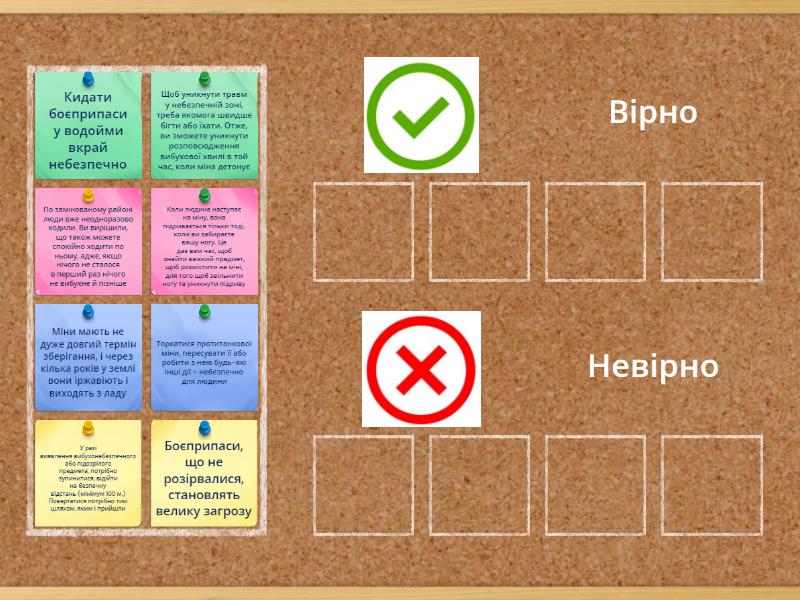 Вірно: Боєприпаси, що не розірвалися, становлять велику загрозу, Торкатися протитанкової міни, пересувати її або робити з нею будь-які інші дії - небезпечно для людини, У разі виявлення вибухонебезпечного або підозрілого предмета, потрібно зупинитися, відійти на безпечну відстань (мінімум 100 м.) Повертатися потрібно тим шляхом, яким і прийшли, Кидати боєприпаси у водойми вкрай небезпечно, Невірно: Коли людина наступає на міну, вона підривається тільки тоді, коли ви забираєте вашу ногу. Це дає вам час, щоб знайти важкий предмет, щоб розмістити на міні, для того щоб звільнити ногу та уникнути підриву, По замінованому районі люди вже неодноразово ходили. Ви вирішили, що також можете спокійно ходити по ньому, адже, якщо нічого не сталося в перший раз нічого не вибухне й пізніше, Міни мають не дуже довгий термін зберігання, і через кілька років у землі вони іржавіють і виходять з ладу, Щоб уникнути травм у небезпечній зоні, треба якомога швидше бігти або їхати. Отже, ви зможете уникнути розповсюдження вибухової хвилі в той час, коли міна детонує,
