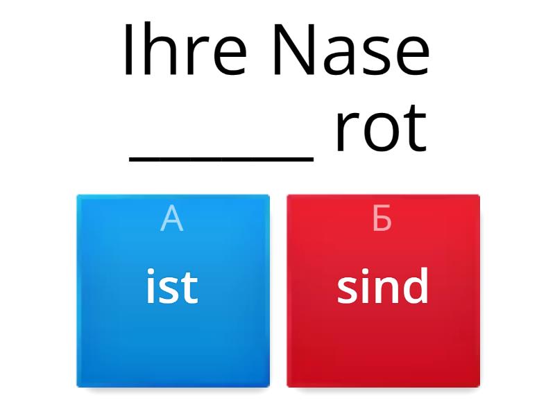 1) Ihre Nase ______ rot a) ist b) sind 2) Tom _____ brav. a) ist b) sind 3) Seine Haare ______ schwarz a) ist b) sind 4) Deine Ohren ____ groß a) ist b) sind 5) Barbara ____ cool. a) ist b) sind 6) Ihre Haare _____ lang a) ist b) sind 7) _____ Max frech? a) ist b) sind 8) Peters Augen ______ blau a) ist b) sind 9) Oliver _____ klug a) ist b) sind 10) Helgas Haare _______ dunkel a) ist b) sind