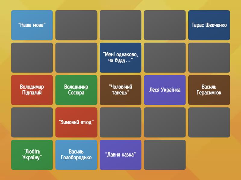 Володимир Сосюра - "Любіть Україну", Леся Українка - "Давня казка", Володимир Підпалий - "Зимовий етюд", Василь Голобородько - "Наша мова", Василь Герасим'юк - "Чоловічий танець", Тарас Шевченко - "Мені однаково, чи буду...", Іван Малкович - "Із янголом на плечі", Ігор Павлюк - "Дівчинка", Галина Кирпа - "Мій ангел такий маленький..."", І. Карпенко-Карий - "Сто тисяч", Михайло Коцюбинський - "Дорогою ціною", Олександр Довженко - "Ніч перед боєм",