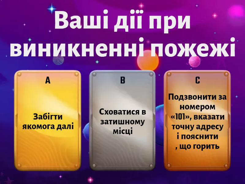 1) Ваші дії при виникненні пожежі a) Забігти якомога далі b) Сховатися в затишному місці c) Подзвонити за номером «101», вказати точну адресу і пояснити , що горить 2) Якщо кімната в диму a) Сховаюсь у ванній кімнаті b) Закрию ніс вологою ганчіркою і залишу приміщення; c) Сховаюсь у шафі 3) Які речі не можна заливати водою? a) Одяг b) Стіл c) Телевізор 4) Яка послідовність зміни кольорів на світлофорі? a) Зелений, червоний, жовтий b) Червоний, жовтий, зелений c) Жовтий, зелений, червоний 5) Де треба ходити пішоходам, якщо відсутній тротуар і велосипедна доріжка? a) По лівому краю дороги b) По правому краю дороги c) По краю проїзної частини назустріч руху транспорту 6) В які ігри можна грати на проїжджій частині? a) В малорухомі b) На дорозі не можна грати c) Тільки в інтелектуальні 7) Як вести себе, якщо йдеш по вулиці один? a) Пригощу незнайому тварину печивом, що б погратися з нею b) Якщо будуть пропонувати сісти в незнайому машину, не підійду до машини c) По дорозі буду розмовляти з усіма незнайомими людьми, щоб не було нудно 8) Що ти будеш робити , якщо відчуєш сильний запах газу? a) Вимкну світло і перевірю звідки пахне газом b) Піду і перевірю одразу звідки пахне газом c) Подзвоню за номером «104», вийду на подвір'я і зачекаю службу газу 9) Мої дії під час повітряної тривоги? a) Залишатися на місці, не рухатись b) Перейти в безпечне місце c) Бігти, не зупиняючись 10) Що потрібно взяти із собою в укриття? a) Рюкзак безпеки b) Телевізор c) Рюкзак з іграшками 11) Коли можна виходити із укриття? a) Коли зголоднів b) Коли тобі набридло c) Коли відбій Повітряної тривоги 12) Коли слід мити руки? a) Коли бачиш бруд на руках b) Перед прийомом іжі c) Тільки коли мама сказала