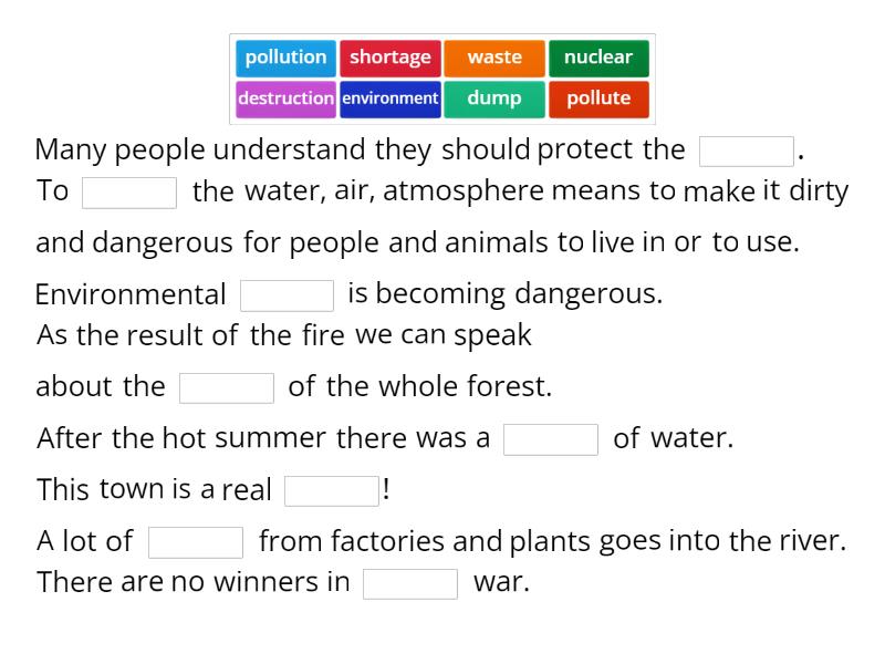 Many people understand they should protect the ____. To ____ the water, air, atmosphere means to make it dirty and dangerous for people and animals to live in or to use. Environmental ____ is becoming dangerous. As the result of the fire we can speak about the ____ of the whole forest. After the hot summer there was a ____ of water. This town is a real ____! A lot of ____ from factories and plants goes into the river. There are no winners in ____ war.