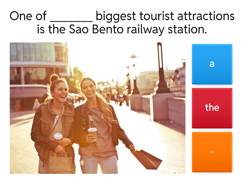 1) One of _______ biggest tourist attractions is the Sao Bento railway station. a) a b) the c) - 2) Porto is ________ second biggest city in Portugal. a) the b) - c) a 3) Porto is situated on the banks of _________ River Douro. a) the b) - c) a 4) Tourists also take _____ boat trips into the Douro. a) - b) an c) a 5) The River Douro flows into ____ Atlantic. a) - b) a c) the